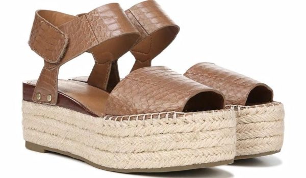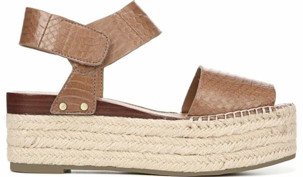 A chunky platform sandal with a hook and loop ankle strap. Animal-printed leather upper. Adjustable hook and loop strap closure. Peep toe. Minimal hardware accents. 2 1/2 inch jute-wrapped platform. Synthetic outsole.